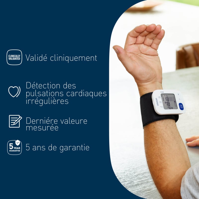 L'OMRON RS1 est un tensiomètre de poignet facile à utiliser et validé cliniquement, conçu pour des contrôles rapides et nomades. Doté d'un brassard de poignet confortable de 13,5 à 21,5 cm et de la technologie Intellisense pour un gonflage en douceur, il fournit des mesures fiables. Il détecte les battements cardiaques irréguliers et enregistre la dernière mesure pour un suivi pratique.