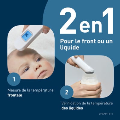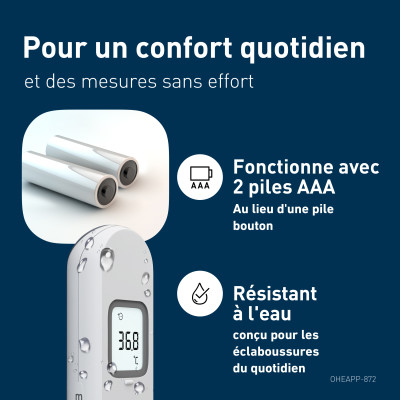 Conçu pour les familles vérification rapide et sans contact de la température avec précision et facilité. Grâce à la technologie avancée des capteurs de distance, fournit des mesures rapides et précises sans aucun contact. Le capteur de distance assure un positionnement correct pour des lectures fiables, et la mesure suivante peut être prise en moins d'une seconde. Le thermomètre est silencieux, facile à manipuler d'une seule main et conçu pour une utilisation rapide. Il peut mesurer la température du front et vérifier la température du liquide. Il enregistre les 30 dernières mesures de température. Il fonctionne avec 2 piles AAA.